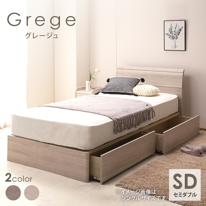セミダブルベッド 引き出し付き グレージュ ライトグレー 引き出し収納付き フルオープンスライドレール付き 【引き出しは左右どちら...