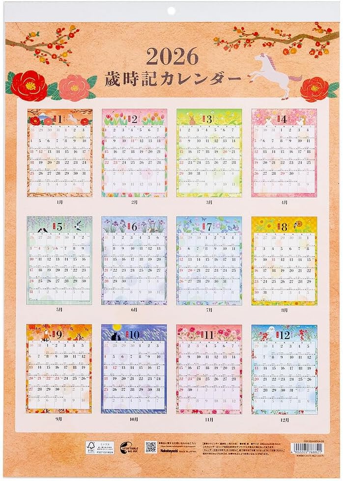 【未使用品】ナカバヤシ 2026 壁掛けカレンダー 歳時記 四六4切 COC-CLH-B3SA-26