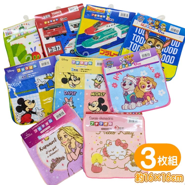 プチタオル キャラクター 3枚セット ミニタオル ハンカチ ディズニー プリンセス プラレール トミカ サンリオ パウパト はらぺ...