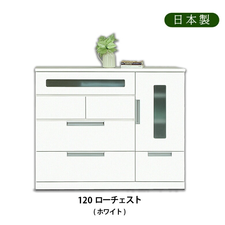 120ローチェスト 幅120cm ホワイト 日本製 完成品 ハイグロスシート ツヤ有り 鏡面 ミストガラス