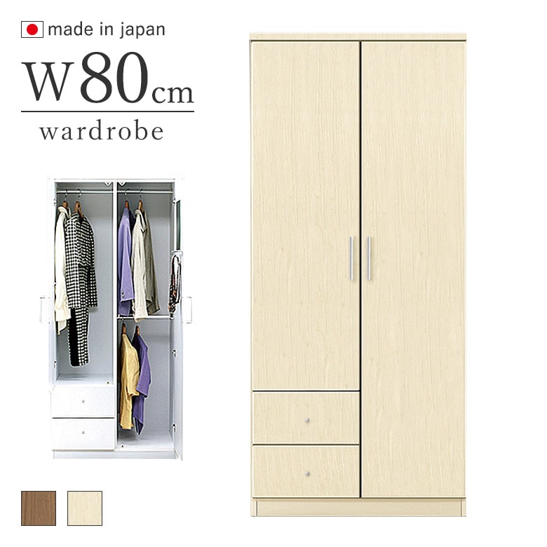 ワードローブ 幅80cm 服吊り ミラー・ネクタイ掛付き 引出しスライドレール付き ホワイト・ブラウン 日本製 完成品