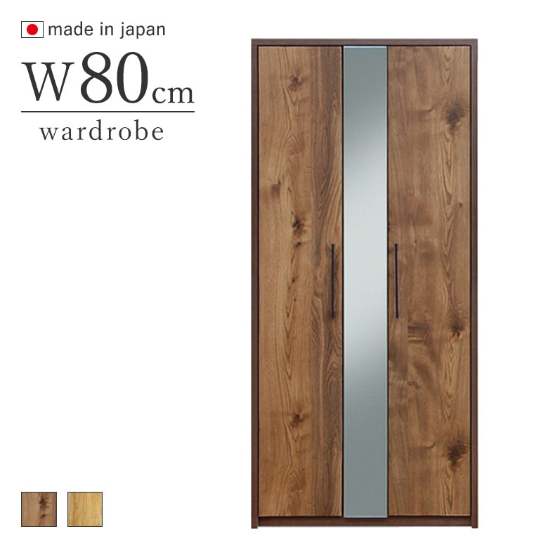 ワードローブ 80cm 服吊り 鏡付き 開き扉タイプ ブラウン・ナチュラル 日本製 完成品 ミラー付き