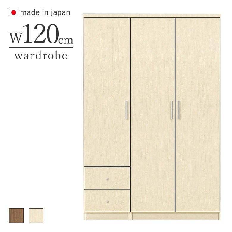 ワードローブ 幅120cm 服吊り ミラーとネクタイ掛け付き 引出しスライドレール付き ホワイト・ブラウン 日本製 完成品(3分割...