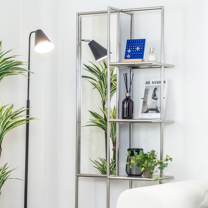 スタンドミラー付き オープンシェルフ ガラス×スチールフレーム シルバー|姿見・全身鏡・収納ラック・飾り棚・ディスプレイ棚・北欧/...