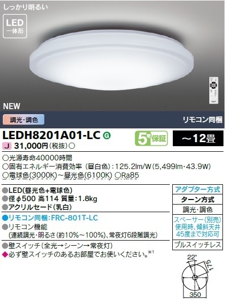東芝 LEDH8201A01-LC LEDシーリングライト(~12畳用/調光・調色)リモコン付 簡易取付形