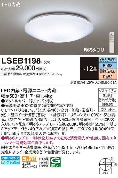 パナソニック LSEB1198 LEDシーリングライト(~12畳用/調光・調色)リモコン付 簡易取付形
