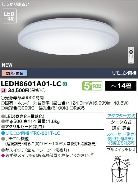 東芝 LEDH8601A01-LC LEDシーリングライト(~14畳用/調光・調色)リモコン付 簡易取付形
