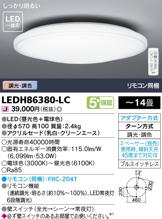 <販売終了>東芝 LEDH86380-LC LEDシーリングライト(~14畳用/調光・調色)リモコン付 簡易取付形