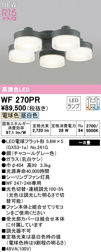 <販売終了品>オーデリック WF270PR|LEDシーリングファン DCモーターファン(6枚羽根) 灯具・LED電球タイプ(電球色...