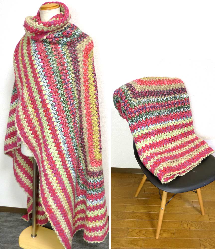 USA 1970sレトロ モチーフ編ハンドメイド ブランケット / ニットブランケット 手編み(162×110cm)【中古】