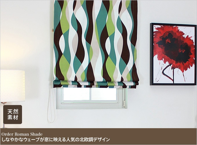【幕体のみ】カラフルな北欧調花柄 綿(コットン)100% ローマンシェード(ブラウングリーン)【買い替え用】