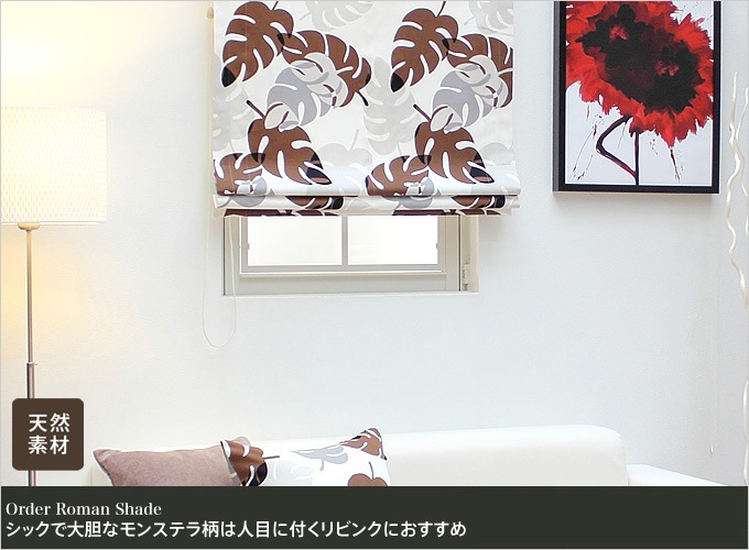 【幕体のみ】モンステラのリーフ柄 綿(コットン)100% ローマンシェード(ブラウングレイ)【買い替え用】