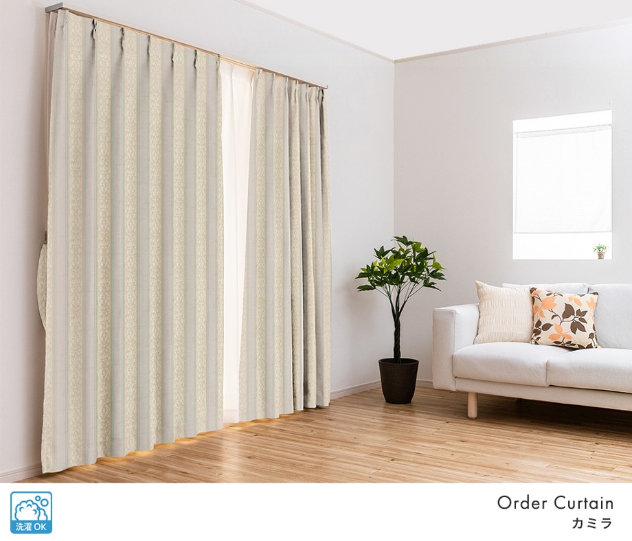 ゴールドのラメ糸がアクセントになったダマスク柄ストライプのドレープカーテン「カミラ」アイボリー