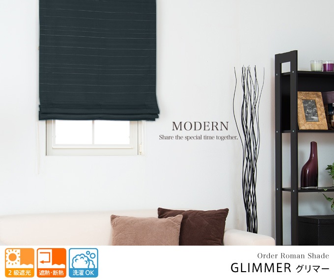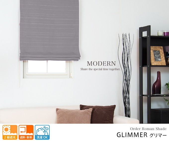 シックなカラーに光沢のあるボーダーが映える2級遮光ローマンシェード「グリマー」(ベージュ)