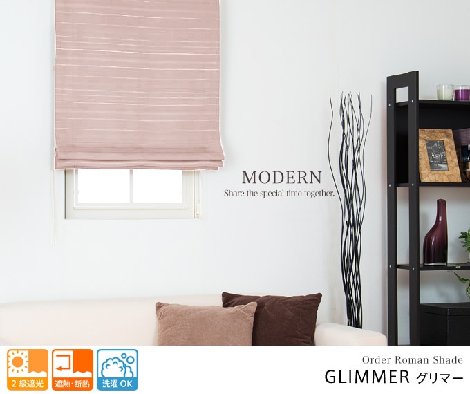 シックなカラーに光沢のあるボーダーが映える2級遮光ローマンシェード「グリマー」(ピンク)