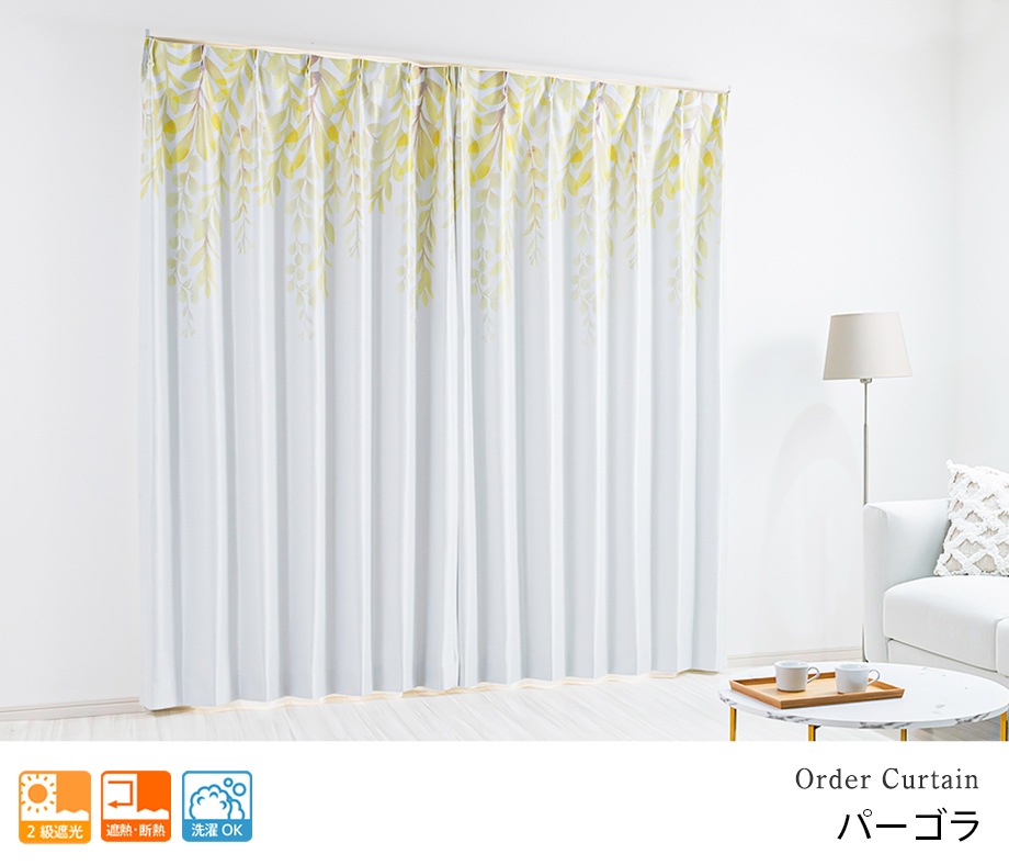 上部にリーフ柄をプリントしたボタニカルデザインの2級遮光カーテン「パーゴラ」イエロー