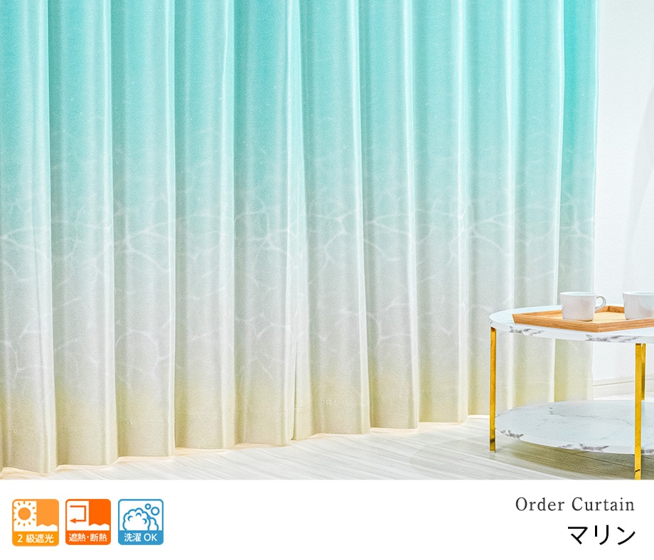 鮮やかなエメラルドブルーの海をイメージした2級遮光カーテン「マリン」ブルー