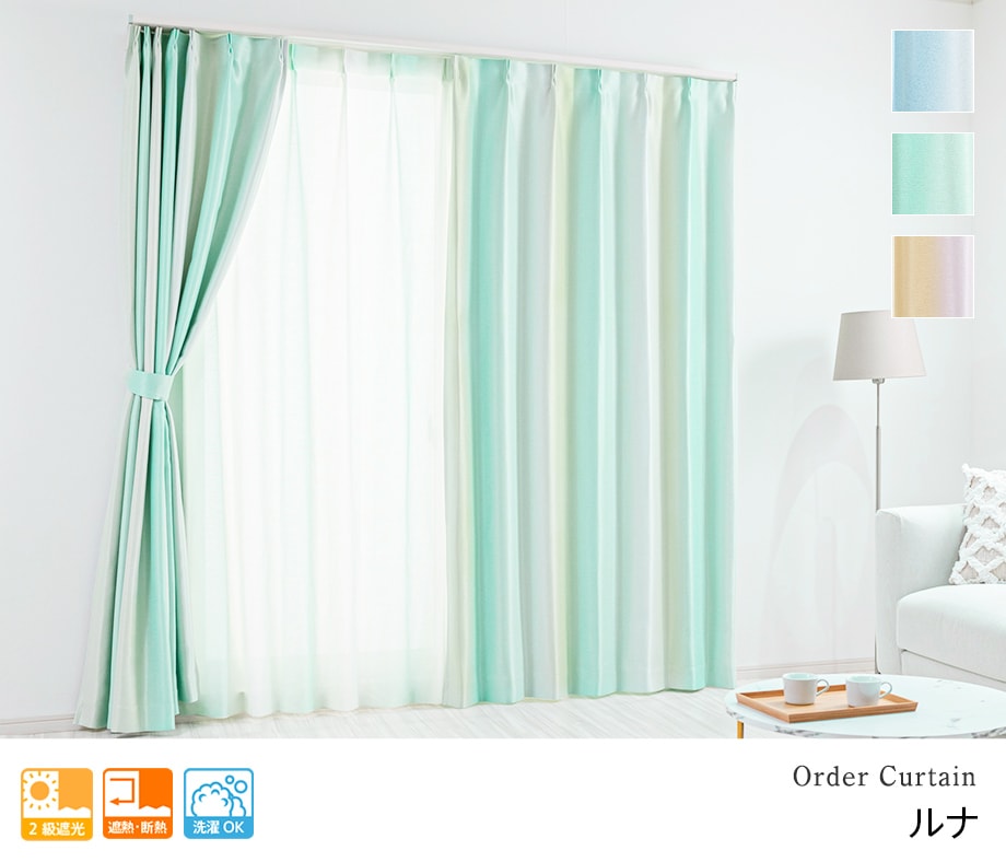 繊細に輝く光沢のグラデーション2級遮光カーテン「ルナ」グリーン
