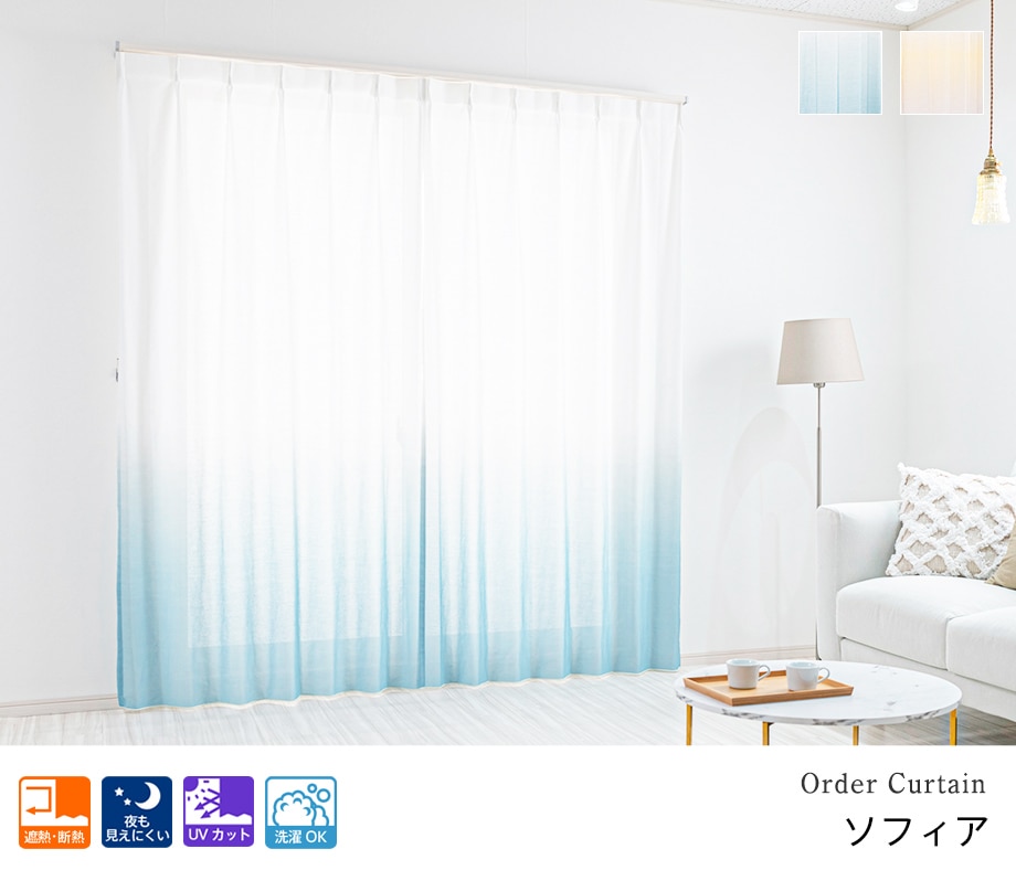 裾に向かって色づくグラデーションの遮像レースカーテン「ソフィア」ブルー