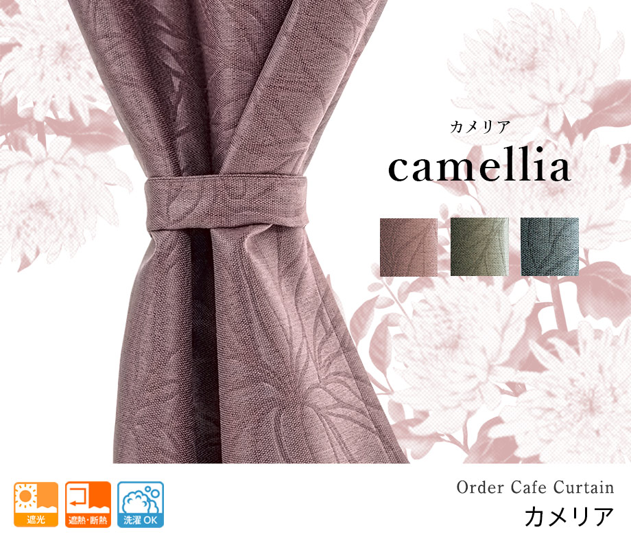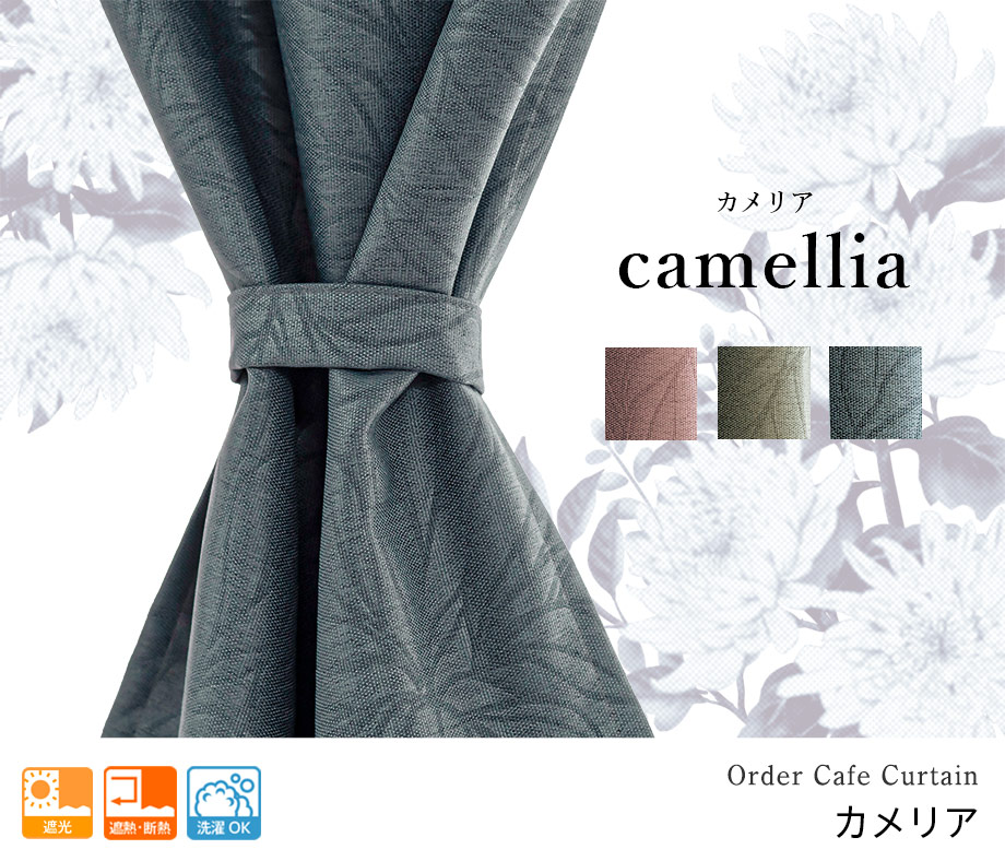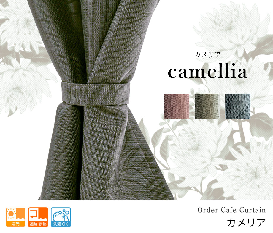 エレガントなエンボス加工を施したボタニカル柄の1級遮光カフェカーテン「カメリア」チャコールグレー