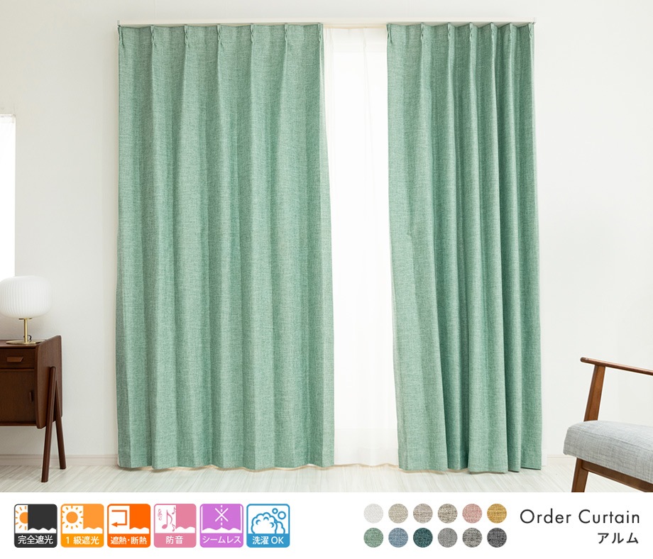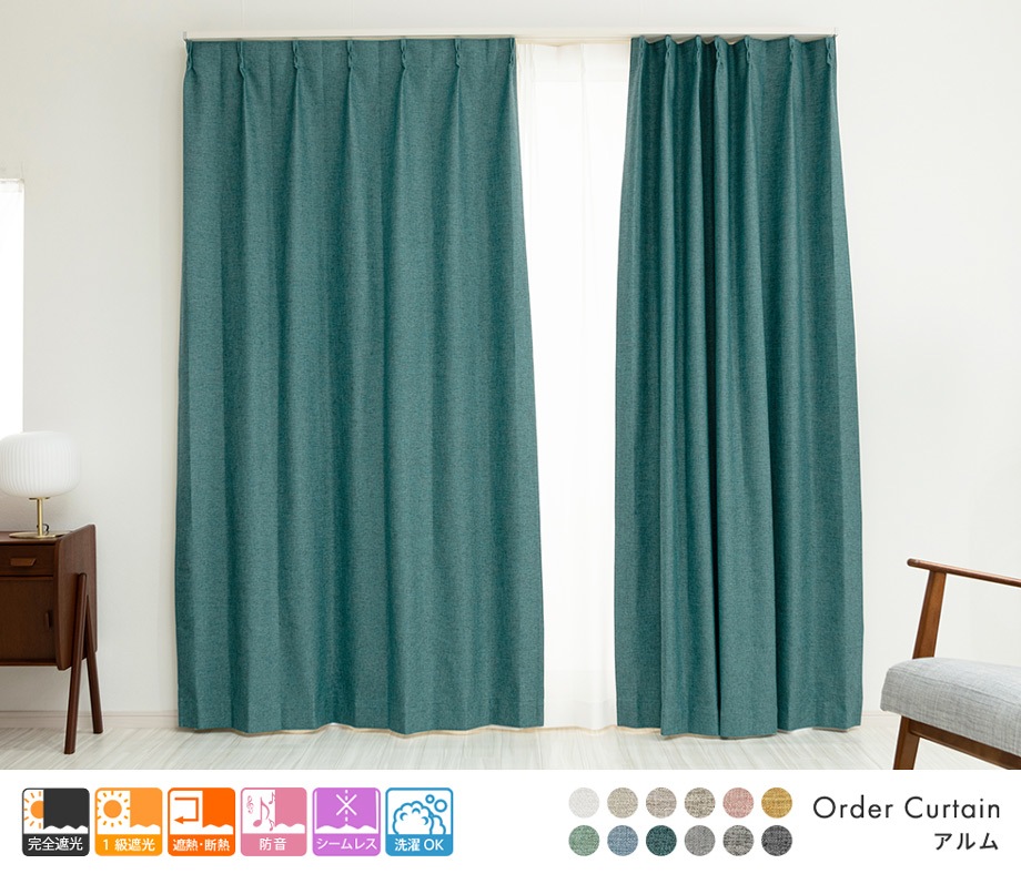 3層構造で軽く柔らかい完全遮光カーテン「アルム」ブルーグリーン