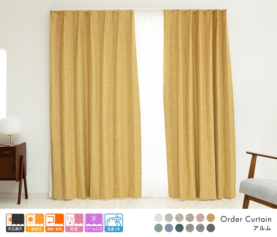 3層構造で軽く柔らかい完全遮光カーテン「アルム」イエロー