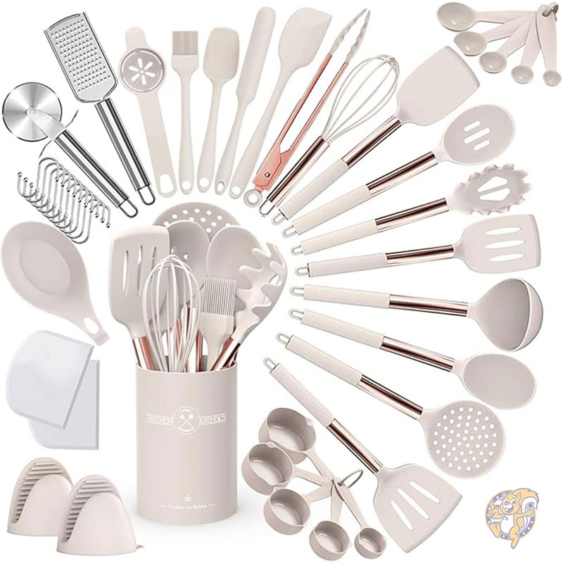 シリコン製キッチン調理器具セット 43 個のスパチュラ調理器具セット ローズゴールド ステンレススチールハンドル ノンスティック耐...