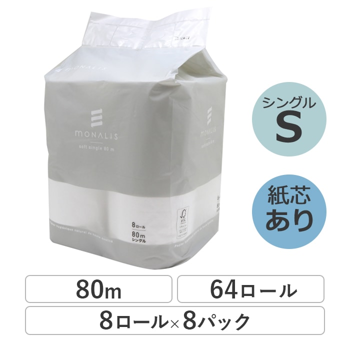 業務用 トイレットペーパー シングル 80m 8ロール 8パック モナリス 芯あり 普通幅(114mm) ミシン目あり 無香料 1...