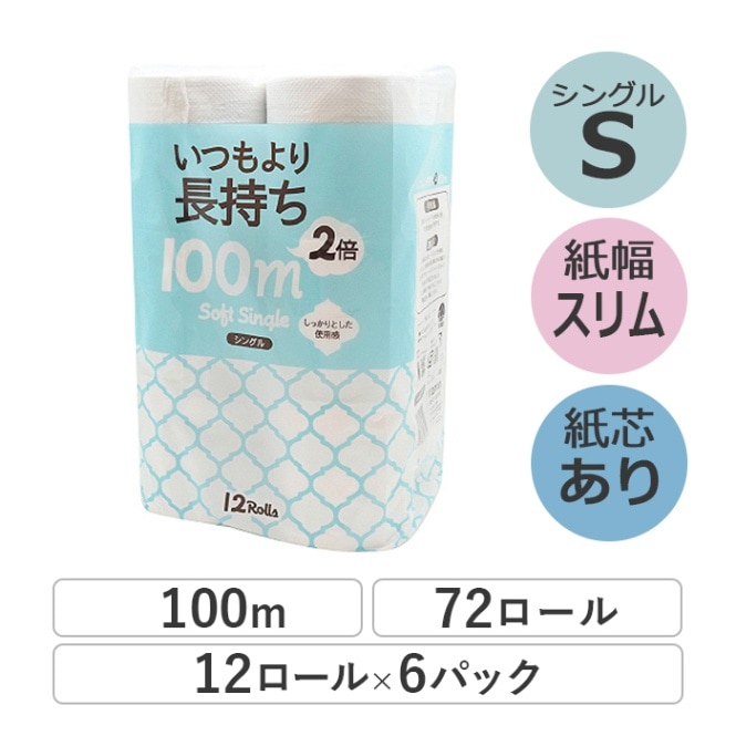 業務用 トイレットペーパー シングル 100m 12ロール 6パック いつもより2倍長持ち 有芯 スリム幅(107mm) ミシン目...