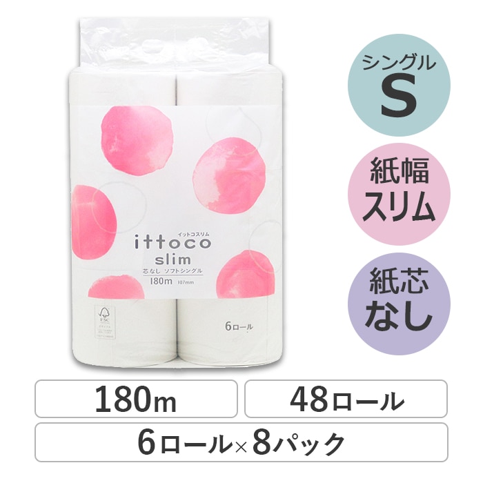 業務用 トイレットペーパー シングル 180m 6ロール 8パック イットコ 芯なし スリム幅(107mm) ミシン目なし 無香料...