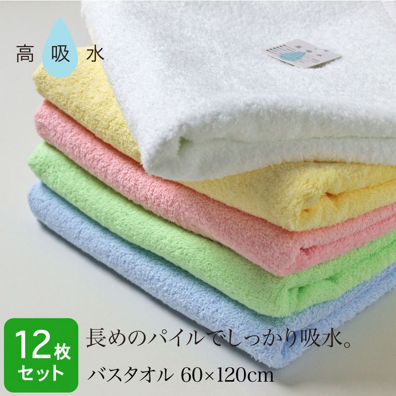 高吸水 カラーバスタオル 約60×120cm やや厚 1000匁・同色12枚セット