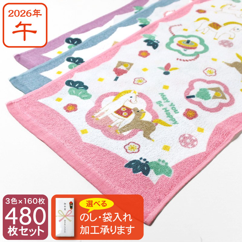 3色の干支タオル お年賀タオル (なかよし ウマ) 2026年 午年 馬 粗品 ご挨拶・480枚セット(3色×各160枚)