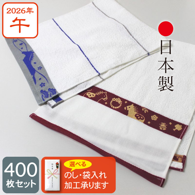 【日本製】干支タオル お年賀タオル 朱子織ジャカード 2026年 午年 馬 粗品 ご挨拶 泉州産・同柄400枚セット