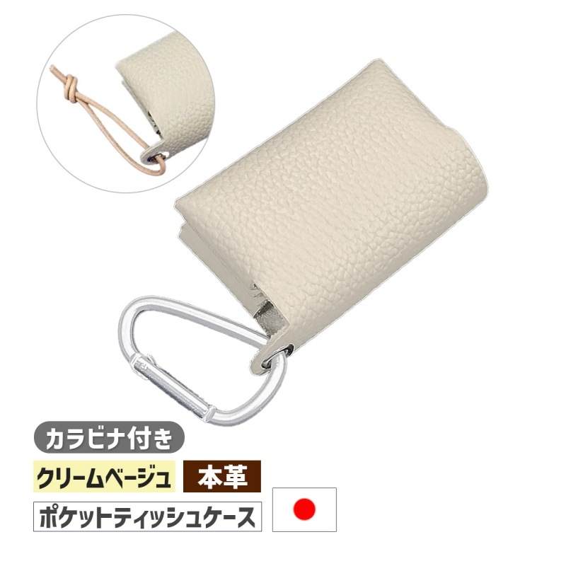[ODMDG10-CB-SV] カラビナ付きポケットティッシュケース DG-10 本革 日本製 クリームベージュ/金具シルバー