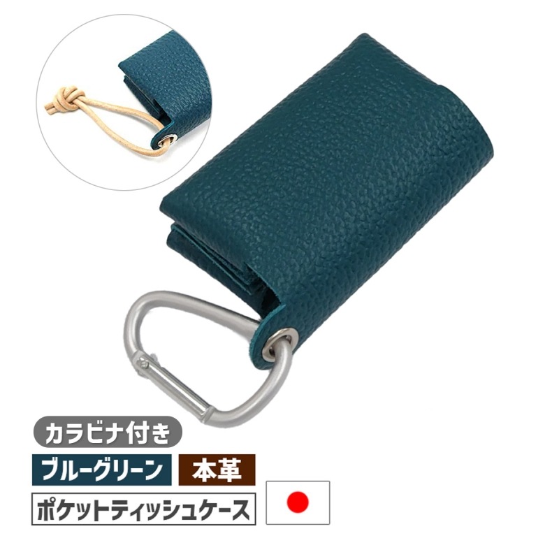 [ODMDG10-BG-SV] カラビナ付きポケットティッシュケース DG-10 本革 日本製 ブルーグリーン/金具シルバー