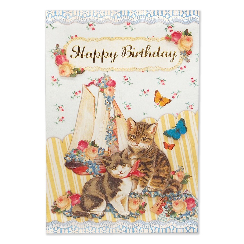 ANTIQUE 【誕生日】 キャット 立体 グリーティングカード (猫4匹×花×かご)