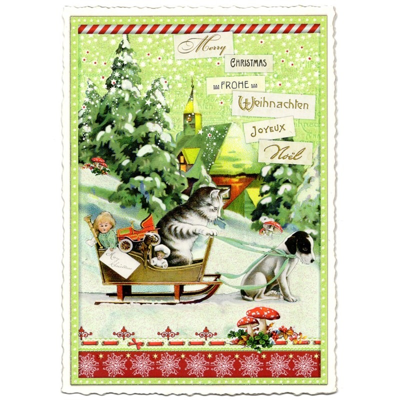 ドイツ製 クリスマス ラメ&ダイカットポストカード (ソリ引く犬とサンタの猫)