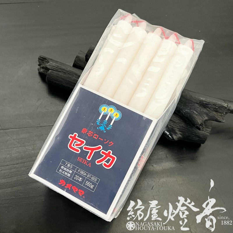色芯蝋燭『丸形色芯ローソク【セイカ(聖火印)・赤芯角袋(S)/7号5(7.5号)/560g[20本入]】PE袋入[燃焼240分]』...
