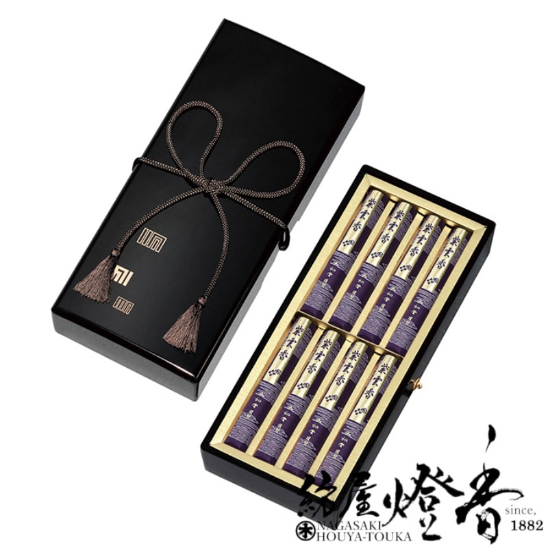 高級進物線香『贈答用【紫雲香(しうんこう)-SHIUNKO-】黒塗箱短寸8把入[有煙]』玉初堂