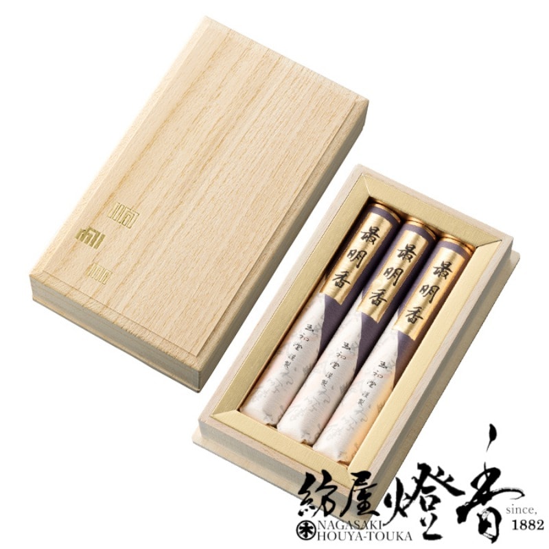 高級進物線香『伝統の薫り【最明香(さいめいこう)-SAIMEIKO-】桐箱短寸3把入[有煙]』玉初堂
