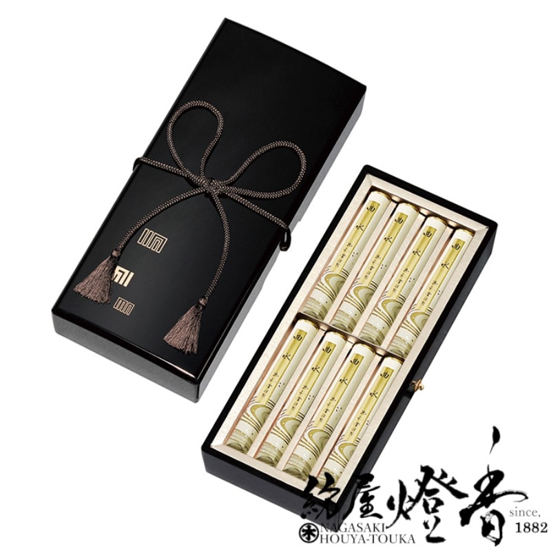 高級進物線香『沈水香木【曲水(きょくすい)-KYOKUSUI-】黒塗箱短寸8把入[有煙]』玉初堂