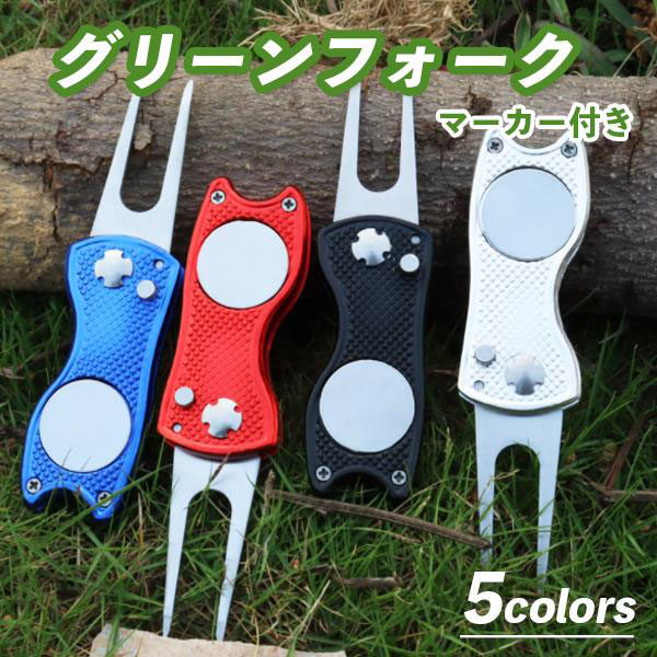 【セール】即納 安い ゴルフ用品 グリーンフォーク マーカー付き 2本刃 ピッチマーク ディボットツール 折り畳み可 フォーク収納...