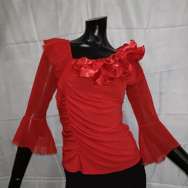 ベルスリーブ フリルトップス 赤 ブラウス 長袖シースルー