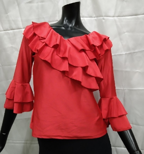 フリルベルスリーブ トップス 七分袖 ブラウス 赤