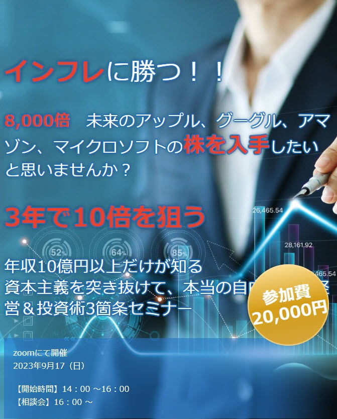 9/17(日)開催 インフレに勝つ 3年で10倍を狙う 年収10億円以上だけが知る資本主義を突き抜けて、本当の自由を得る経営&投資...