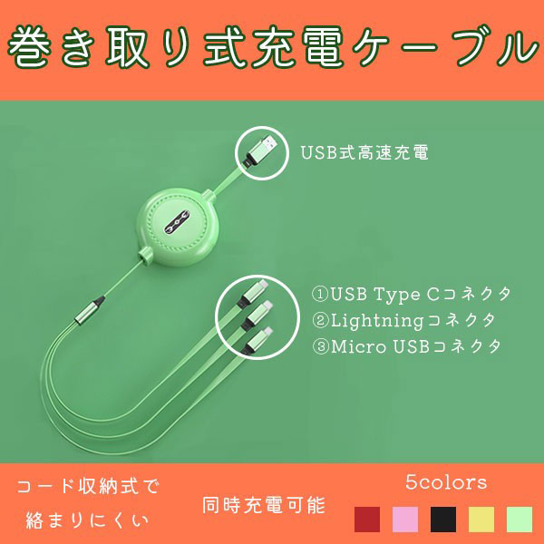 急速充電 充電ケーブル 3in1 iPhone 充電 ケーブル USB Type-c