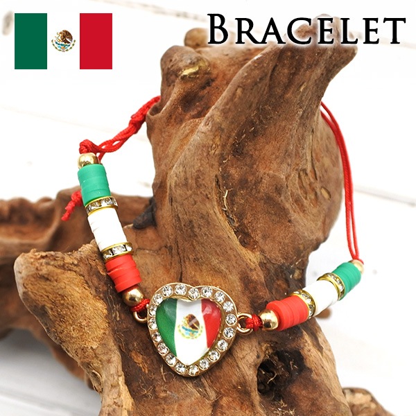 ブレスレット メキシコ国旗 ハート レッド グリーン ホワイト キラキラ ブレス 紐 ヒモ ラインストーン チャーム 国旗 MEX...