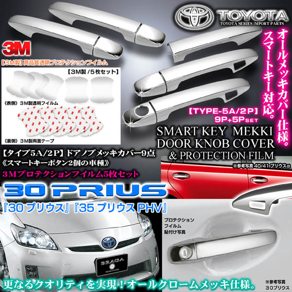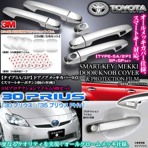 30プリウス【タイプ5A/2P】メッキ ドアノブ/ハンドル カバー&保護透明フイルム[14点セット]スマートキー2個/ブラガ