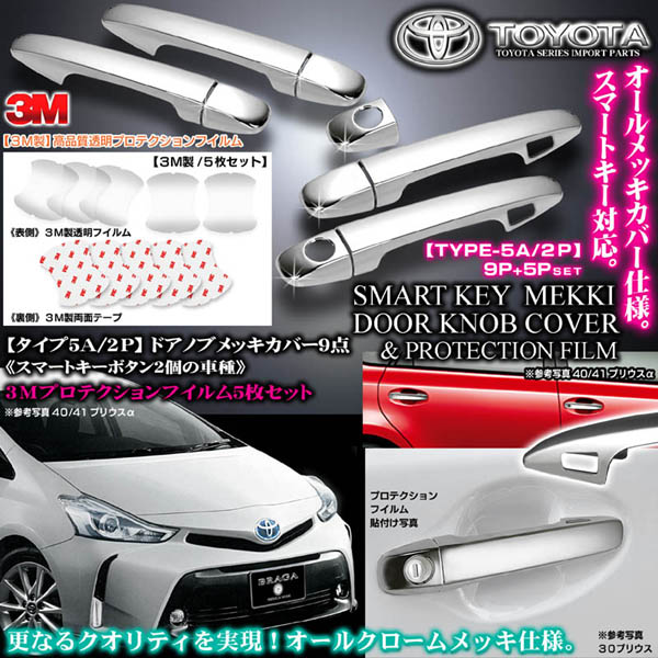 40/41プリウスαアルファ【タイプ5/2P】メッキ ドアノブ/ハンドル カバー《スマートキーボタン2個用/9点セット》ブラガ