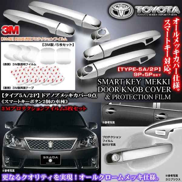トヨタ/セダン車【タイプ5A/2P】メッキ ドアノブ/ハンドル カバー&保護透明フイルム[14点セット]スマートキー2個/ブラガ